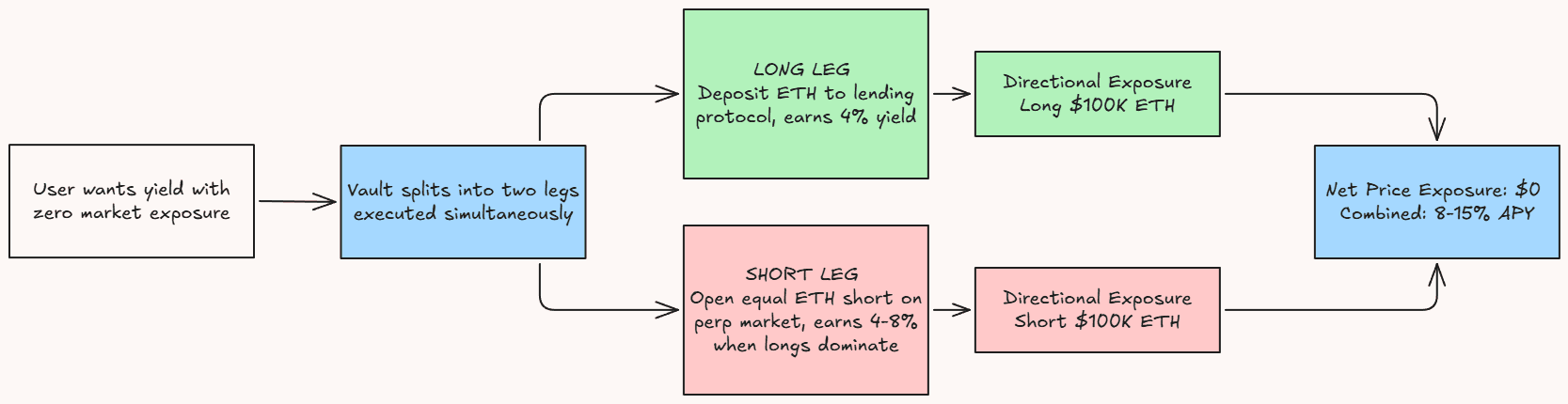 The vault opens a long on a spot asset via lending and an equal short via a perp simultaneously. The directional exposure cancels out.
