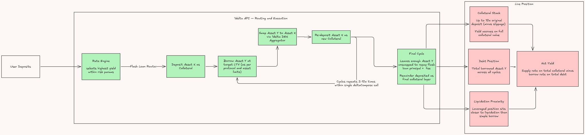 Looping Vault | deltaCompose executes the full loop atomically in one transaction |