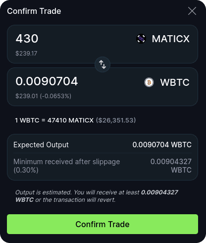 A pop-up window will show the overview of the trade. You can execute the trade by clicking on Confirm Trade and confirm the transaction with your wallet: