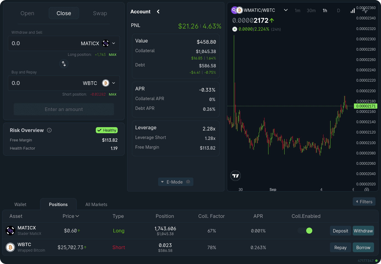 The platform's user-friendly interface facilitates both partial and complete position closures, allowing users to adapt to changing market conditions and optimize their investment strategies. Whether you're looking to reduce exposure, reallocate funds, or explore new investment avenues, 1delta provides the tools and insights needed to navigate the volatile crypto landscape with confidence.